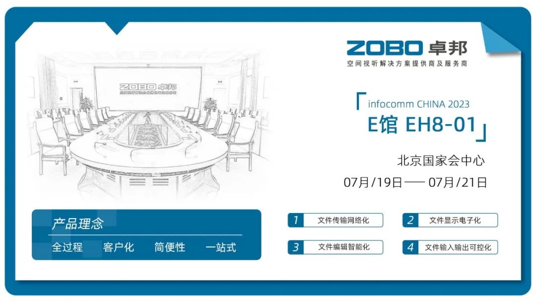 ZOBO无纸化会议系统,具备文件传输网络化、文件显示电子化、文件编辑智能化和文件输入输出可控化的特点,真正意义上为视听领域带来全新体验,提供智慧交互可视化管控平台。